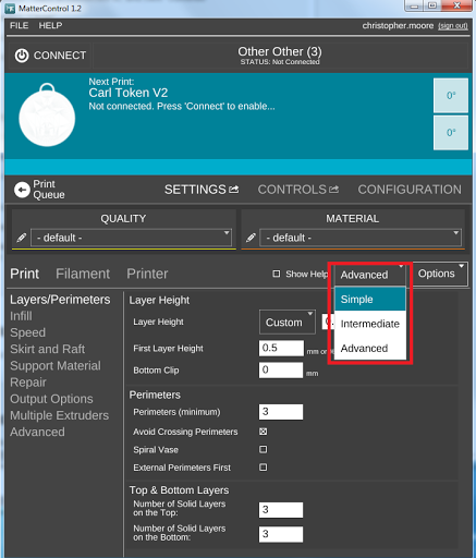 'Advanced' allows you to control every aspect of your print, including all the above features, plus Repairs, Output Options, Multiple Extruders, and other advanced content.
